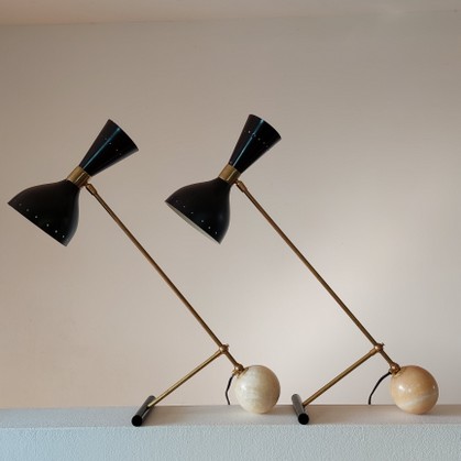 ein paar grosse fifties tischleuchten mit doppeltem reflektor. arredoluce, italien zugeschrieben. die neigung lässt sich verstellen. gegengewicht aus poliertem marmor in etwas unterschiedlicher tönung. messinggestänge mit gelenk oben und tubenförmigem stahlfuss, original um 1950 (keine replika!) in schwarz, unten geschraubte e27, oben geschraubte e14-fassung mit porzellanringen.