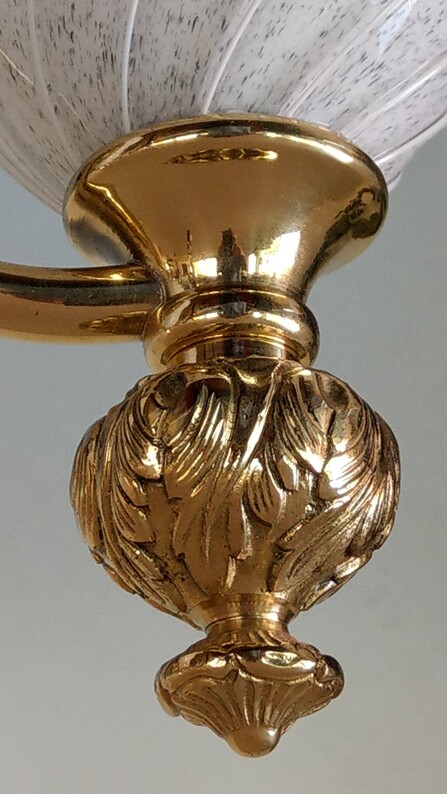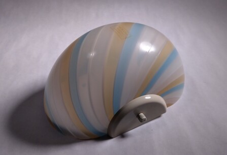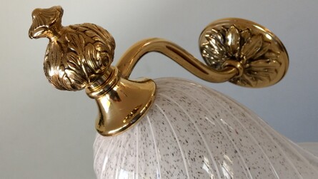 repräsentative stilleuchten von effetre international, vetri murano 023. weiss überfangenes muranoglas mit dunklen, punktförmigen einschlüssen, mit leichter drehung. auf schwerer messingmontage, floral. ausgezeichneter originalzustand. montiert berührt der glasrand direkt die wand, was einen schönen lichtwurf ergibt...