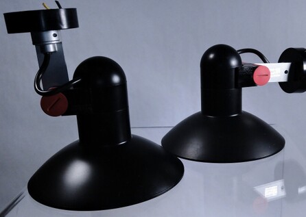 zwei schwarze spotleuchten von erco, entworfen vom wohl bekanntesten französischen produktdesigner roger tallon ca 1974