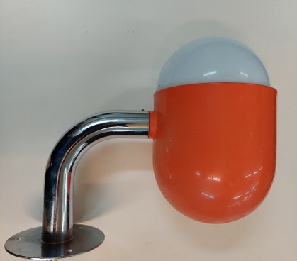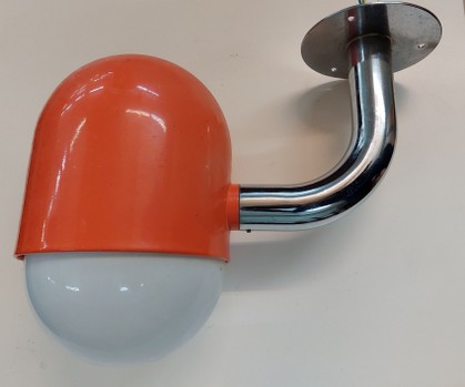 eine coole wand- oder deckenleuchte aus den späten 60ern / frühen 70erjahren. vollmetall. halterung verchromt, reflektor oranges blech. fixe montage, nicht drehbar etc. e27 porzellanfassung mit opalglas gewindekugel.