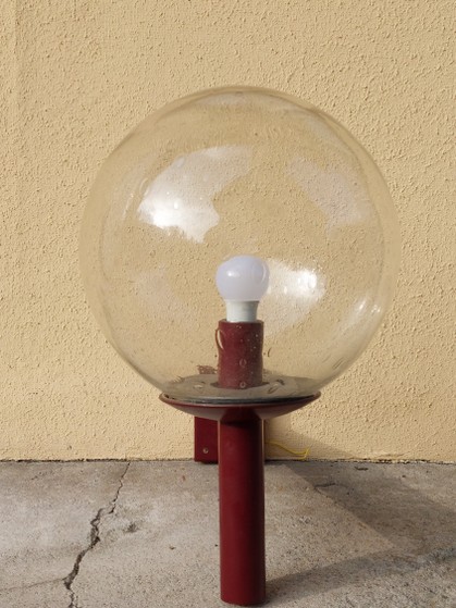 typische und grosse aussen-wandleuchte aus den 70erjahren. vermutlich limburg. klarglaskugel mit einschlüssen an vollmetall-ausleger in bordeaux. ausgezeichneter originalzustand