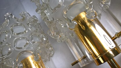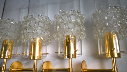 edle und seltene, mundgeblasene wandleuchten / appliquen. schweizer design, fällander glas, fällanden bei zürich. vergoldete wandhalterung mit je 1 e27 fassung. klare glaszylinder mit aufgesetztem glasblasenmuster, durchbrochen. dazu passend 2 deckenleuchten (siehe dort)