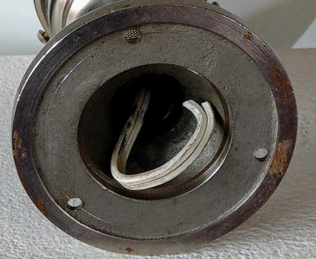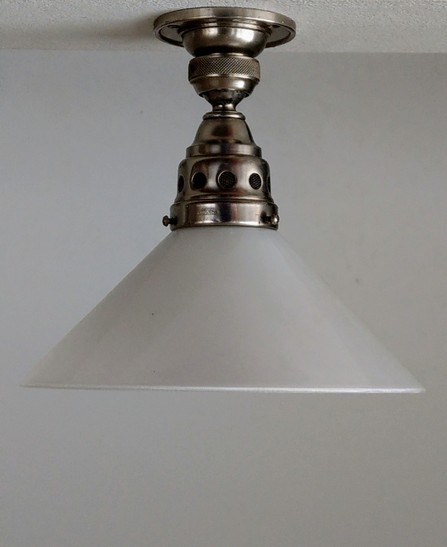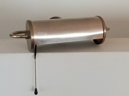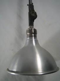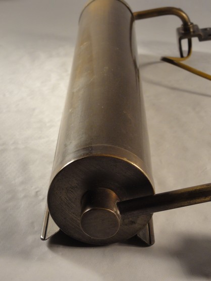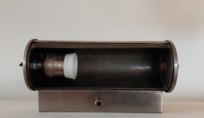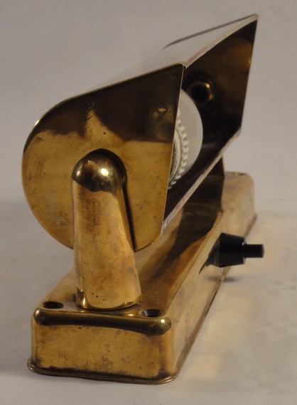 grosser, kippbarer kupferreflektor mit holophane glas. der (nicht sichtbare) innenreflektor aus ehemals verspiegeltem glas mit defekt (kann aber auch ganz ausgebaut werden ohne lichtverlust)
