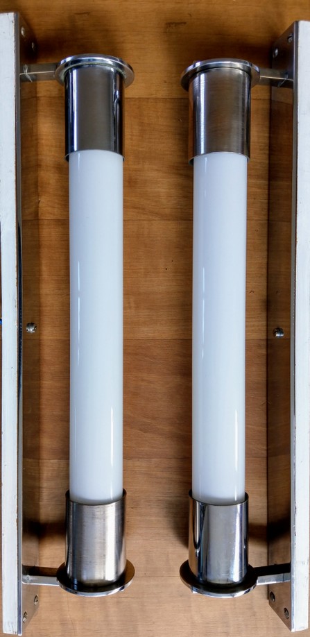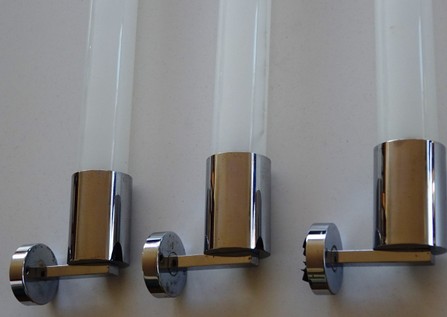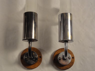 2 charaktervolle chromappliquen auf holzmontagen, zur verwendung mit kerzenschaftbirnen 35 cm (auf wunsch lieferbar) oder mit normalen e27