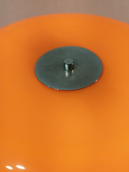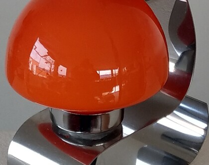 kleine (Nacht-)tischleuchte aus einem geschweiften chromband mit orange überfangenem opalglas in pilzform