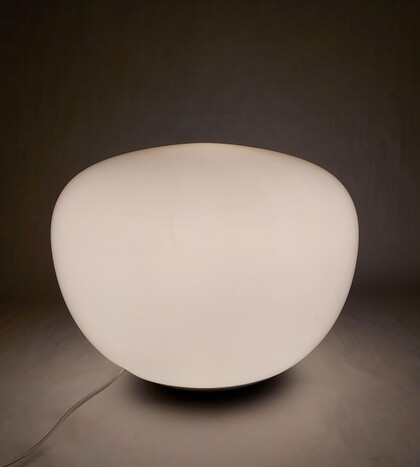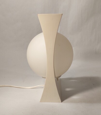 grosse und schön verarbeitete polypropylen-leuchte in form einer abgeflachten kugel auf gewölbtem aluminium-stand mit e27-gewinde und dimmer.