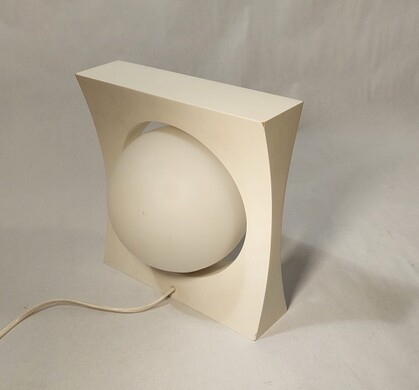 seltene und ausgesprochen formvollendete skulpturenleuchte aus den sixties im stil von verner panton. mattierte opalglaskugel in geschweiftem, kubischem holzrahmen. crèmeweiss. vermutlich skandinavien
